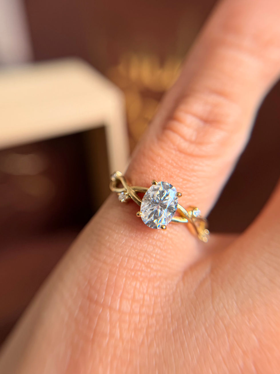 O Anel Garden com uma Moissanite central oval, de aproximadamente 5x7mm.