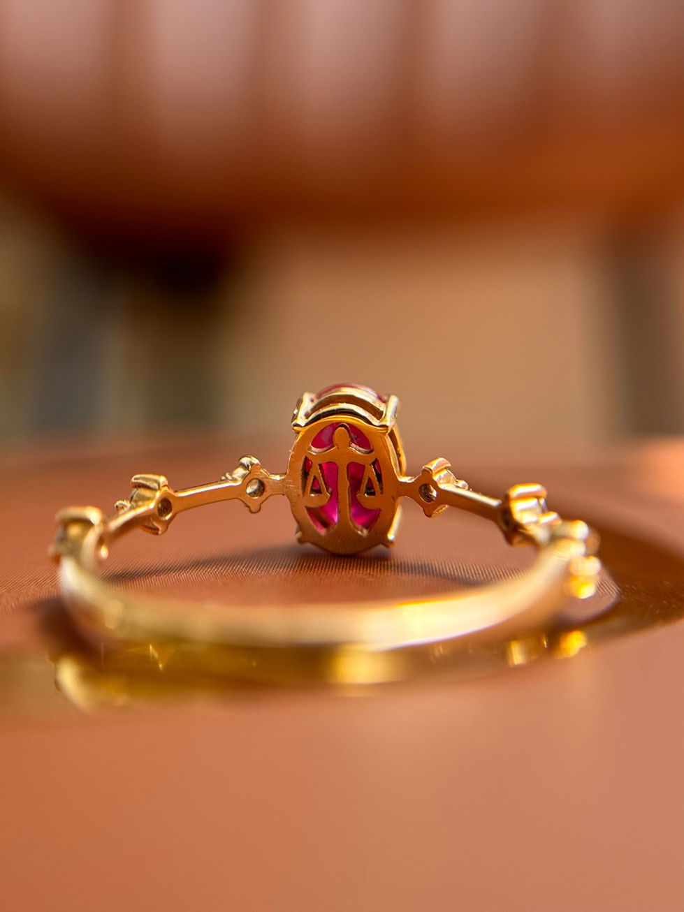 Anel Vita | design desenvolvido para as formandas em Direito, com Rubi natural aliado à balança, símbolos do curso. Finalizado com 6 Diamantes naturais de 1.5pt cada.